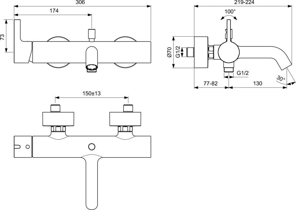 Głowica ceramiczna 38 mm z ogranicznikiem temperatury wody. Logo Ideal Standard umieszczone na korpusie baterii. Metalowy uchwyt bez oznaczenia wody ciepłej i zimnej. Zawór zwrotny. Osłonięte i wyciszone przyłącza ścienne. Aerator typu Caché M24x1i. Automatyczny przełącznik wanna/natrysk.