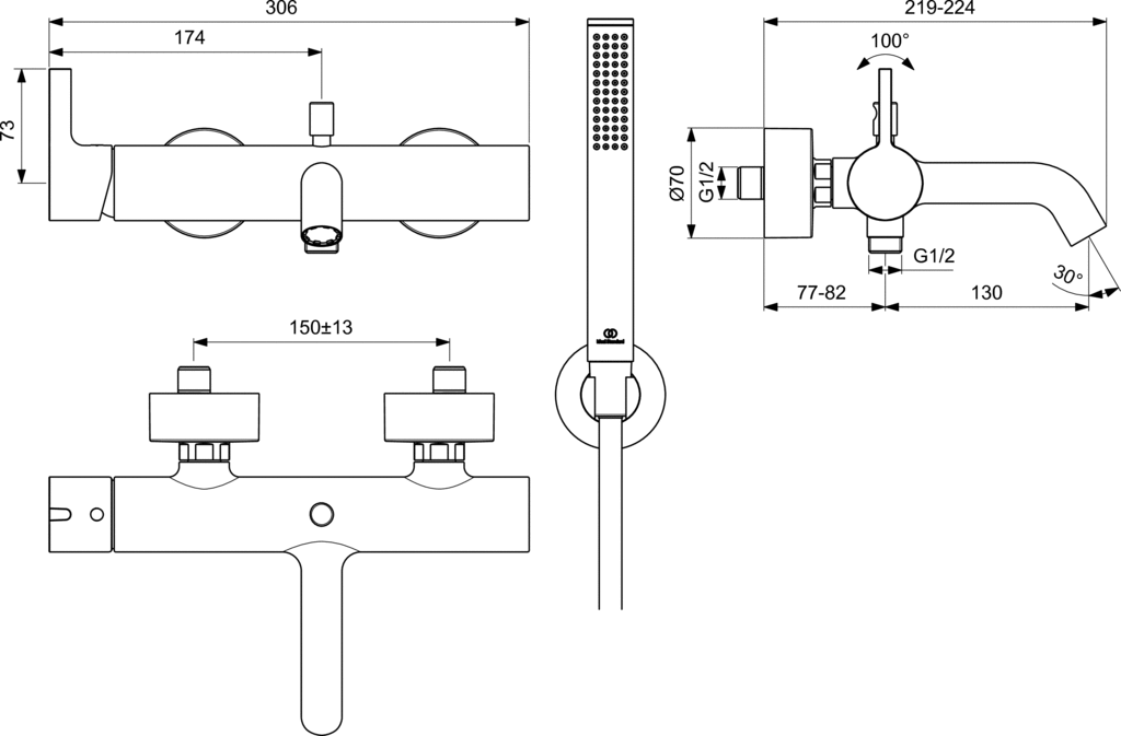 Głowica ceramiczna 38 mm z ogranicznikiem temperatury wody. Logo Ideal Standard umieszczone na korpusie baterii. Metalowy uchwyt bez oznaczenia wody ciepłej i zimnej. Zawór zwrotny. Osłonięte i wyciszone przyłącza ścienne. Aerator typu Caché M24x1i. Automatyczny przełącznik wanna/natrysk. Akcesoria: metalowa minisłuchawka. Wąż natryskowy IdealFlex 1600mm. Cylindryczny uchwyt ścienny słuchawki.