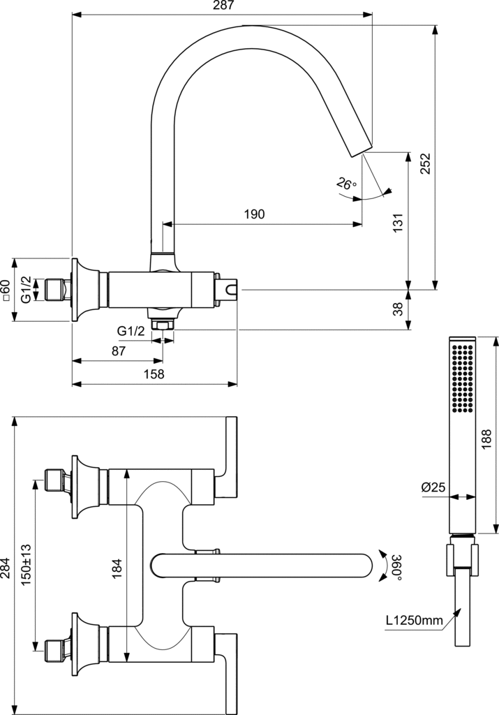 Bateria natryskowo-wannowa, Dual Control, uchwyty dźwigniowe.
