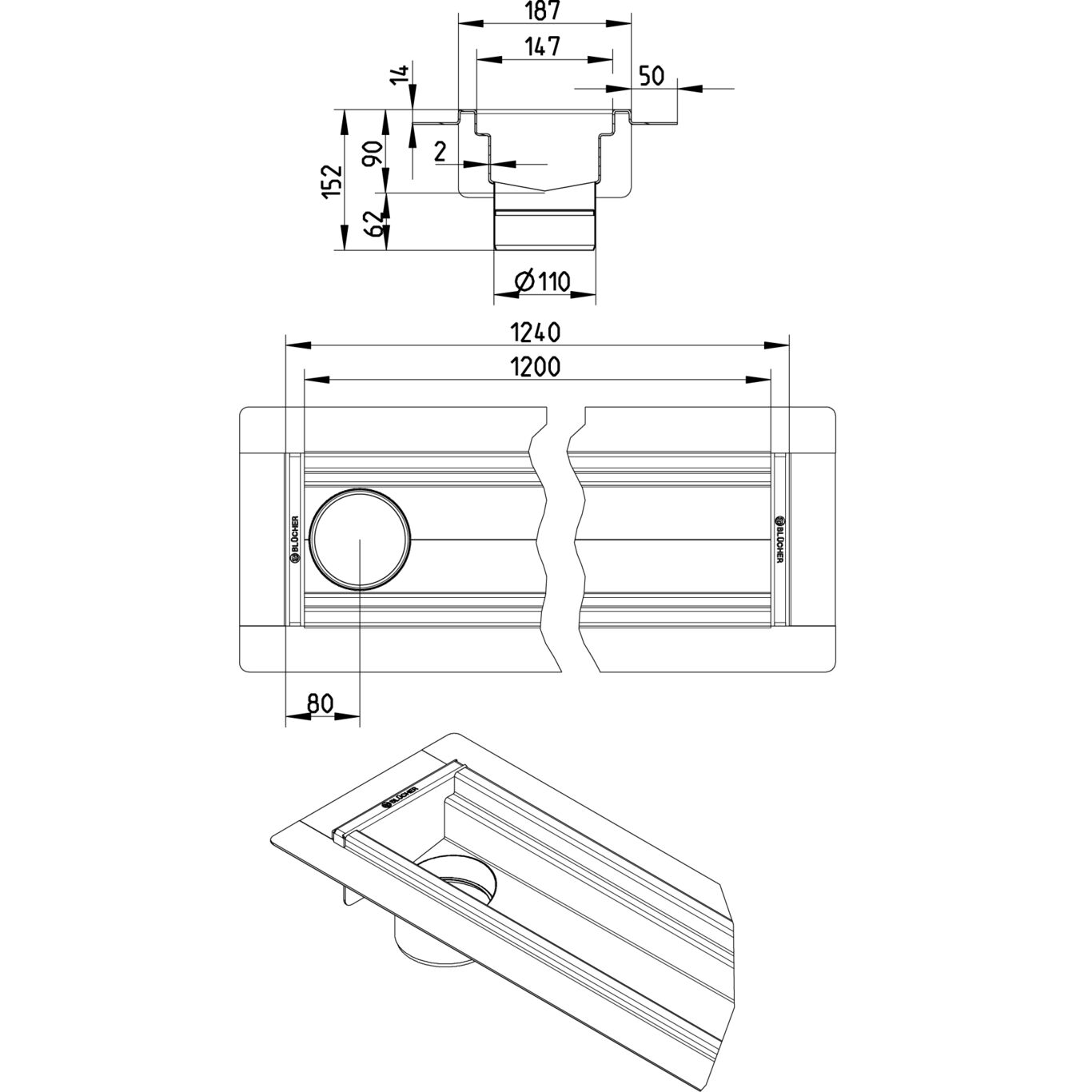 Kanał 150x1200 z odpływem na końcu kanału DN 110, z kołnierzem do izolacji wylewanej, wymiar wewn. 187x1240 mm
