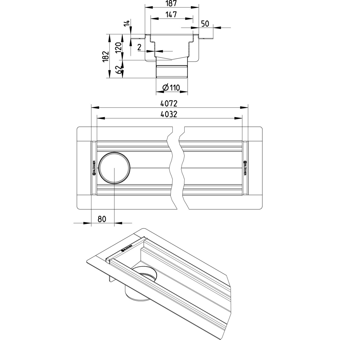 Kanał 150x4000 z odpływem na końcu kanału DN 110, z kołnierzem do izolacji wylewanej, wymiar wewn. 187x4072 mm