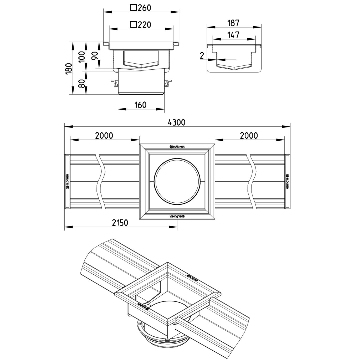 Kanał 150x4000 ze skrzynką wlotową 220x220 na środku odpływ DN 160, wymiar zewn. 187mm x4300 mm