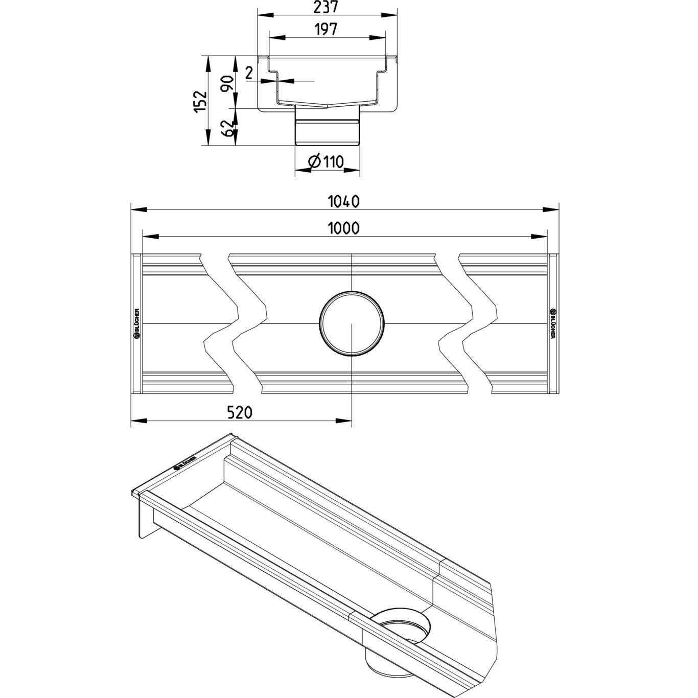 Kanał 200x1000 odpływ na środku DN 110 wymiar zewn. 237mm x1040 mm, stal kwasoodporna