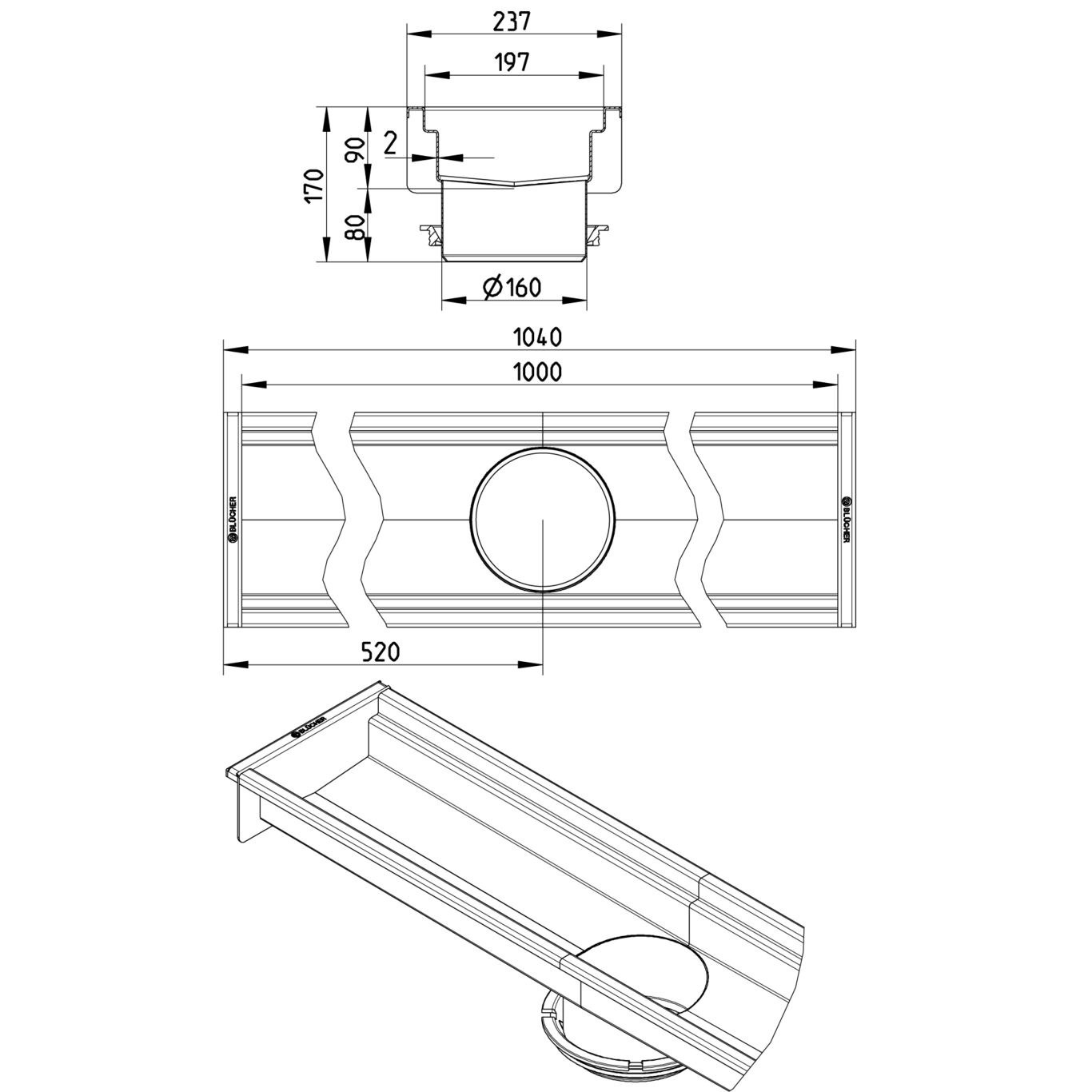 Kanał 200x1000 odpływ na środku DN 160 wymiar zewn. 237mm x1040 mm, stal kwasoodporna