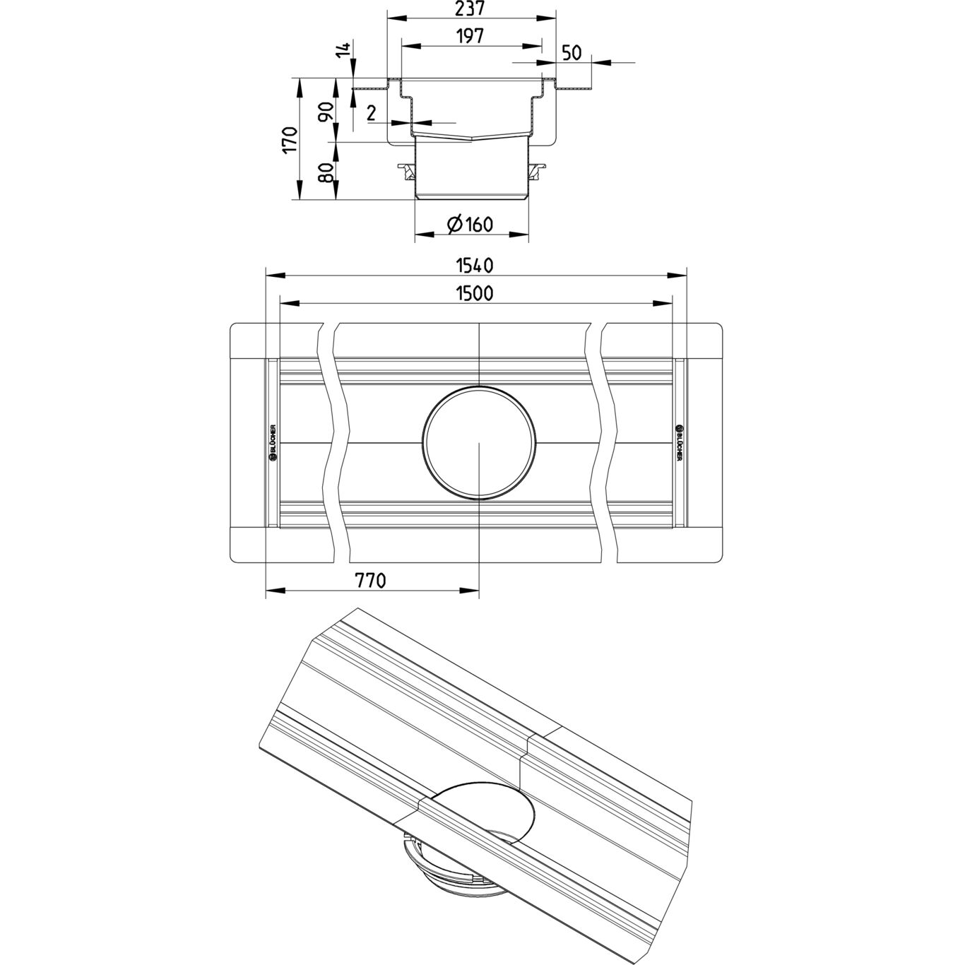 Kanał 200x1500 z odpływem na środku kanału DN 160, z kołnierzem do izolacji wylewanej, wymiar wewn. 237x1540 mm