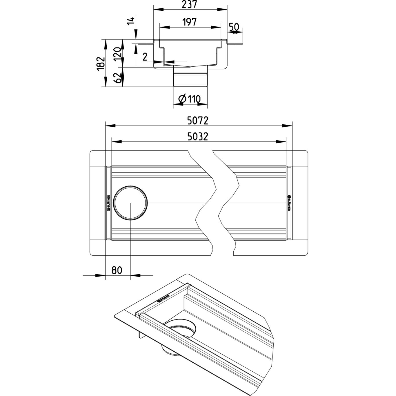 Kanał 200x5000 z odpływem na końcu kanału DN 110, z kołnierzem do izolacji wylewanej, wymiar wewn. 237x5072 mm