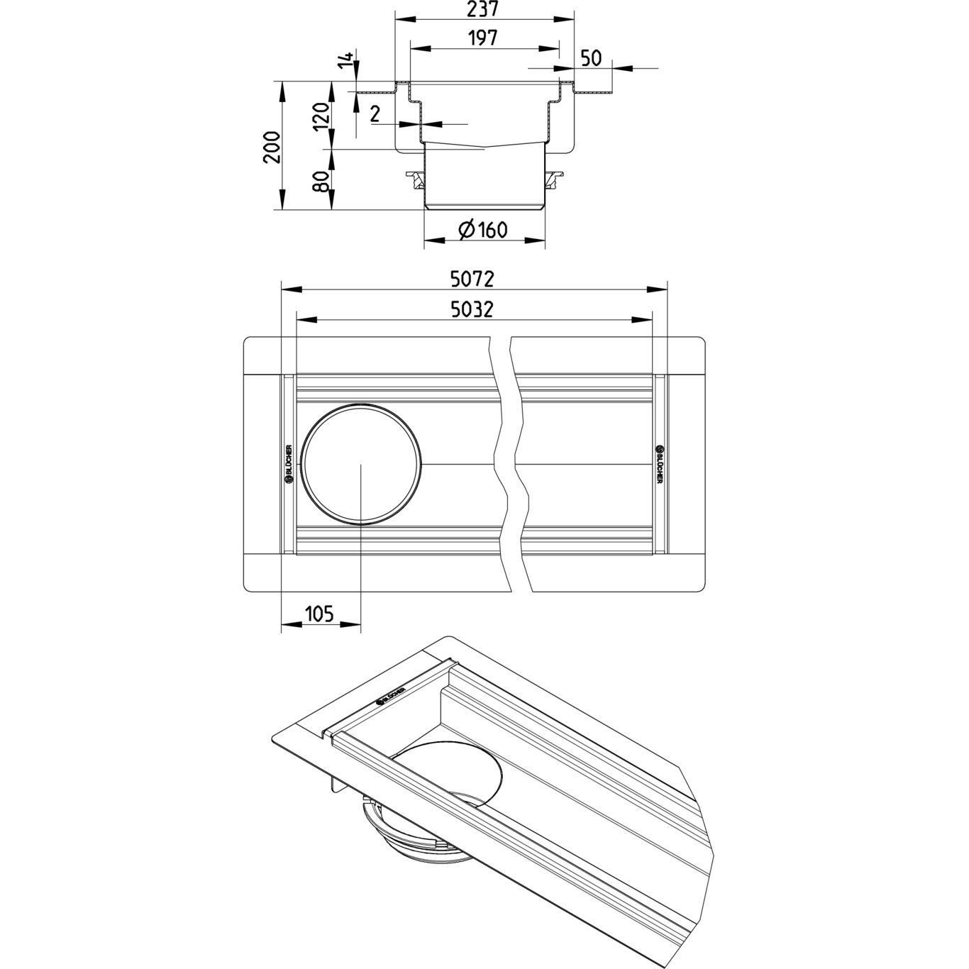 Kanał 200x5000 z odpływem na końcu kanału DN 160, z kołnierzem do izolacji wylewanej, wymiar wewn. 237x5072 mm