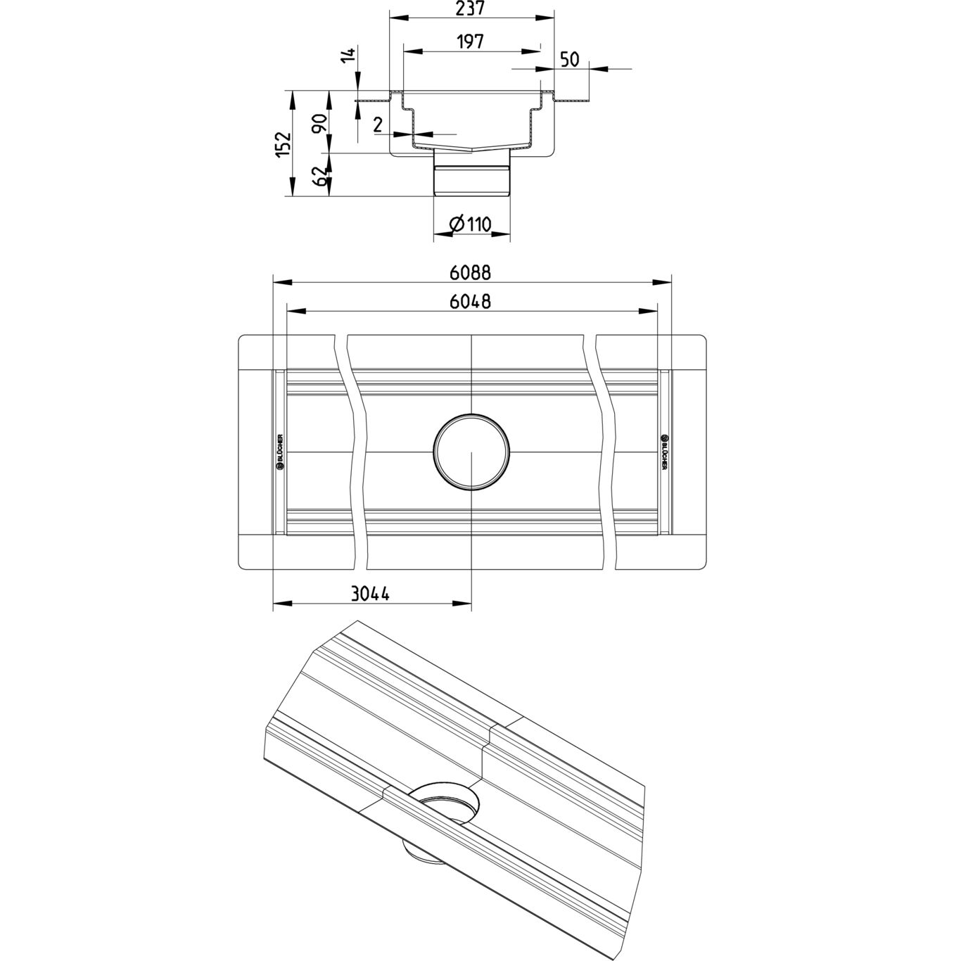 Kanał 200x6000 z odpływem na środku kanału DN 110, z kołnierzem do izolacji wylewanej, wymiar wewn. 237x 6088 mm