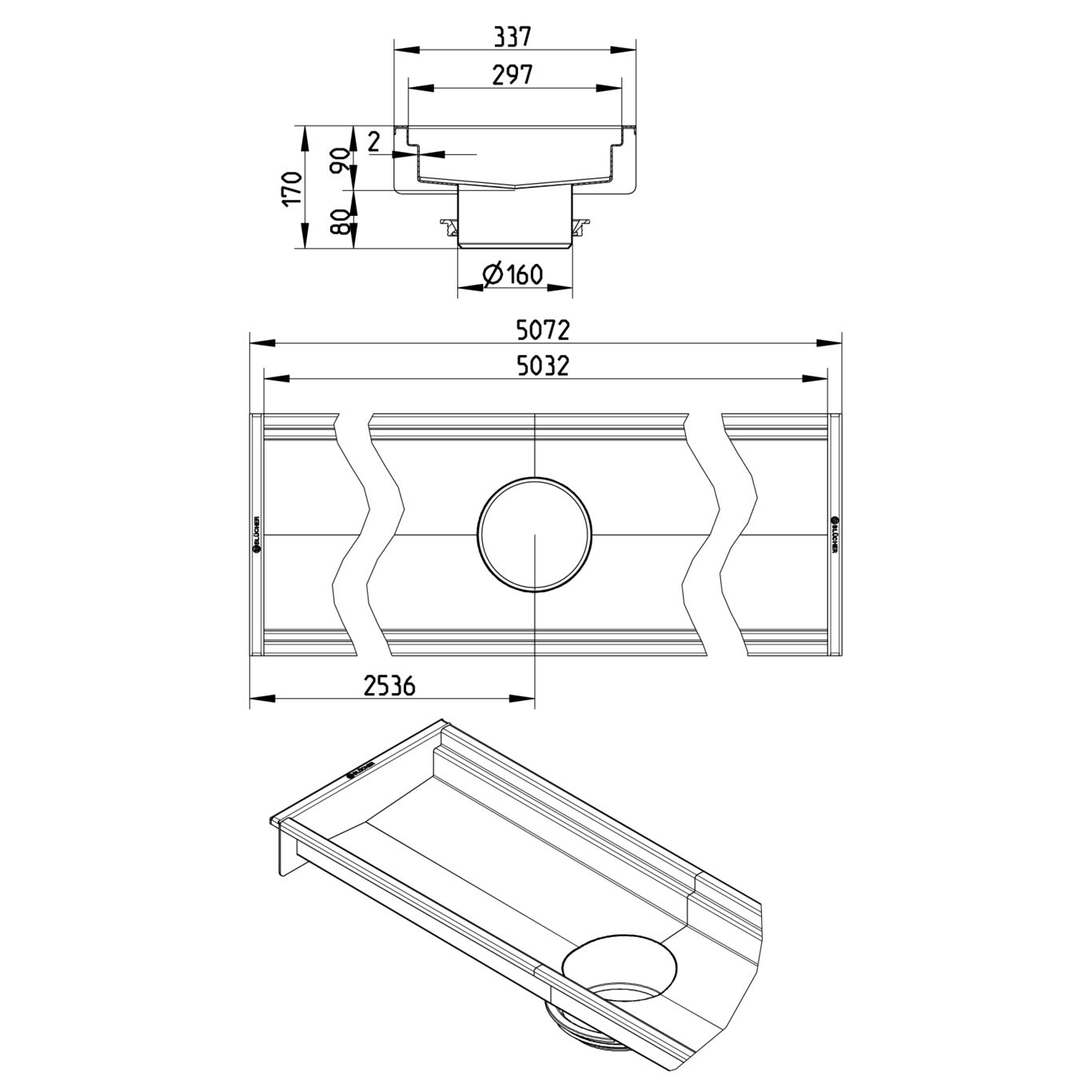 Kanał 300x5000 odpływ na środku DN 160 wymiar zewn. 337mm x5072 mm