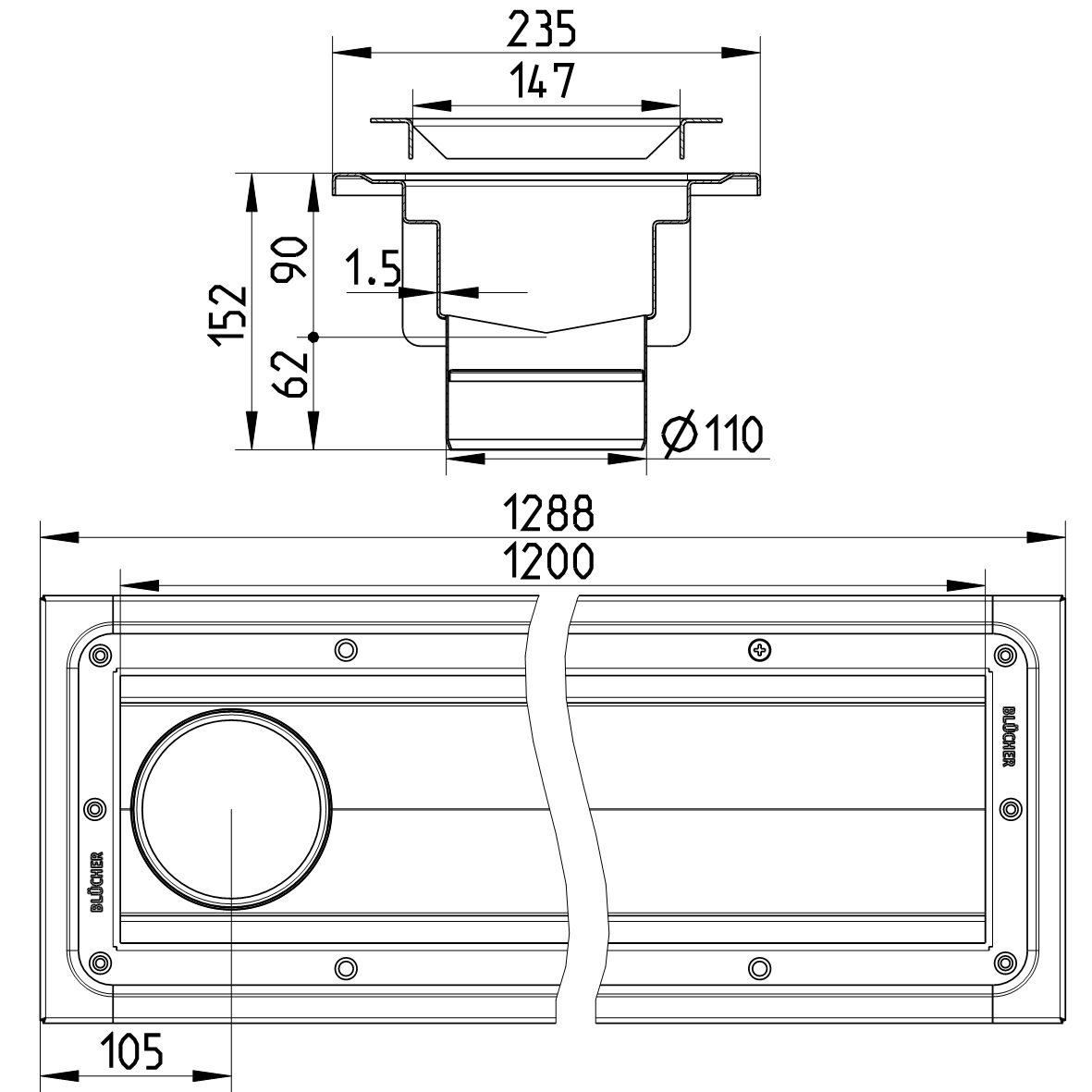 Kanał do winylu 150x1200, z odpływem na końcu odpływ DN 110, wymiar zewn. 235 mm x 1288 mm