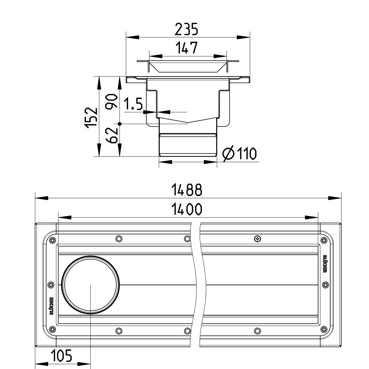 Kanał do winylu 150x1400, z odpływem na końcu odpływ DN 110, wymiar zewn. 235 mm x 1488 mm
