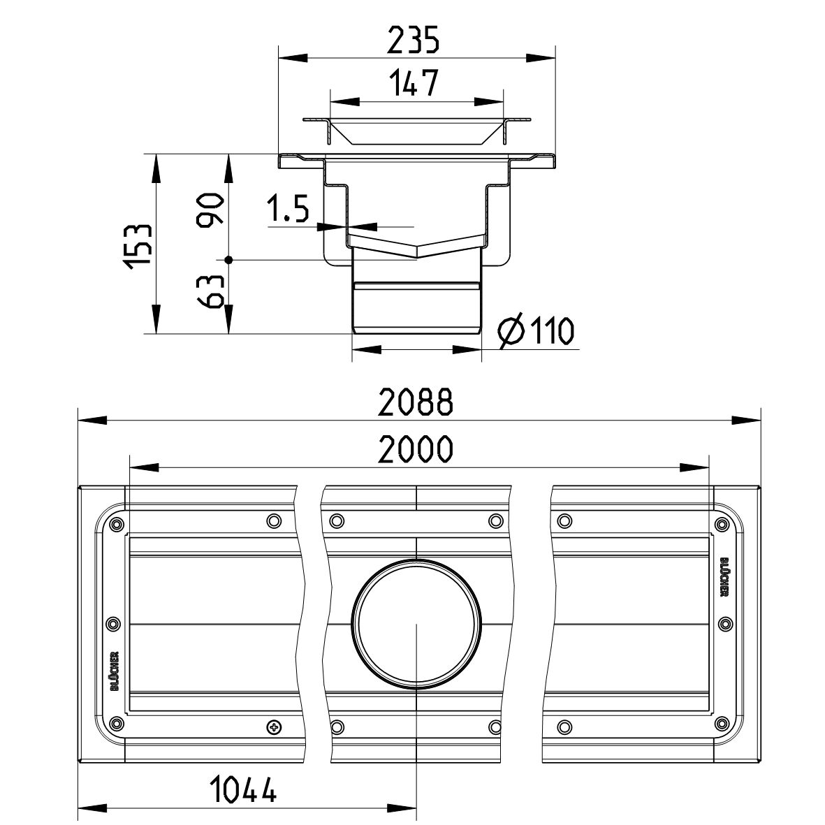 Kanał do winylu 150x2000, z odpływem na środku odpływ DN 110, wymiar zewn. 235 mm x 2088 mm