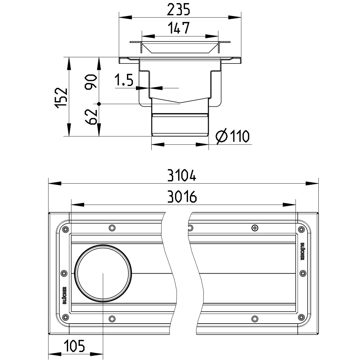 Kanał do winylu 150x3000, z odpływem na końcu odpływ DN 110, wymiar zewn. 235 mm x 3104 mm