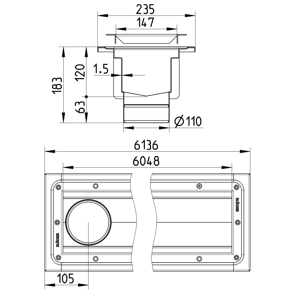Kanał do winylu 150x6000, z odpływem na końcu odpływ DN 110, wymiar zewn. 235 mm x 6136 mm