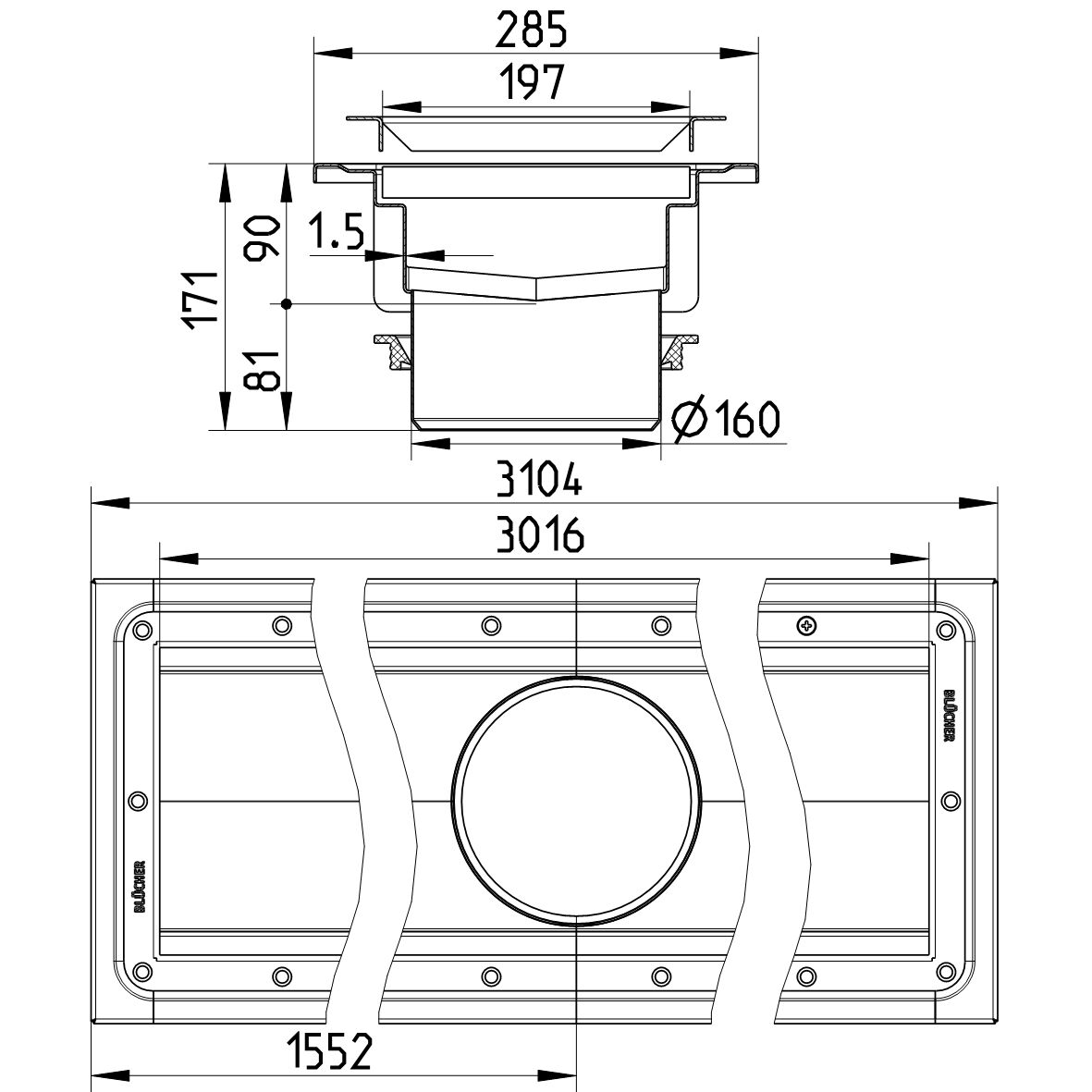 Kanał do winylu 200x3000, z odpływem na środku odpływ DN 160, wymiar zewn. 285 mm x 3104 mm