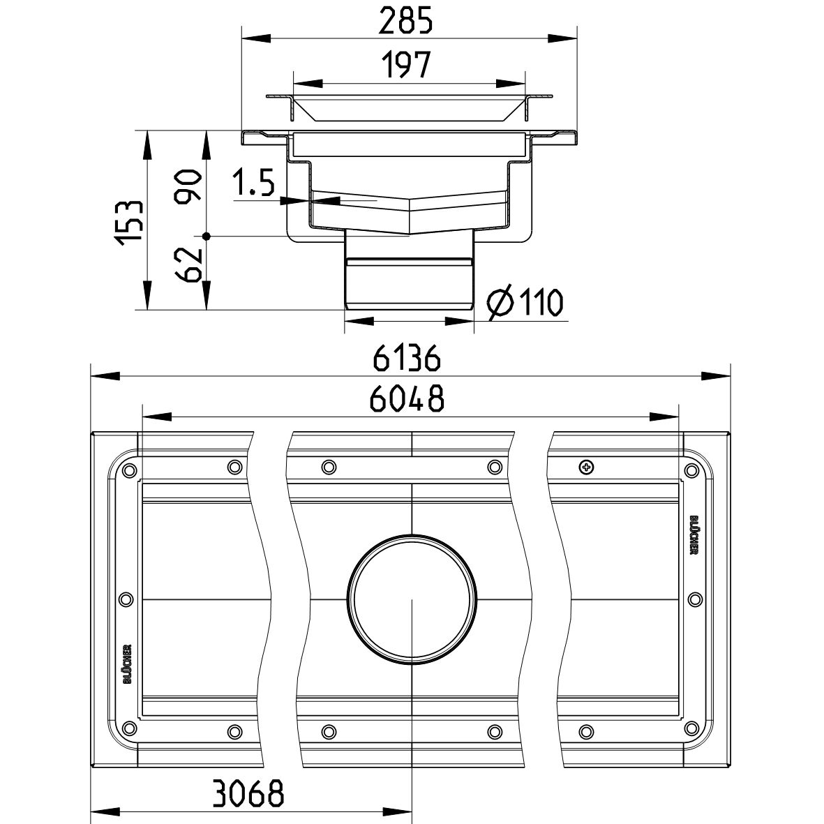 Kanał do winylu 200x6000, z odpływem na środku odpływ DN 110, wymiar zewn. 285 mm x 6136 mm