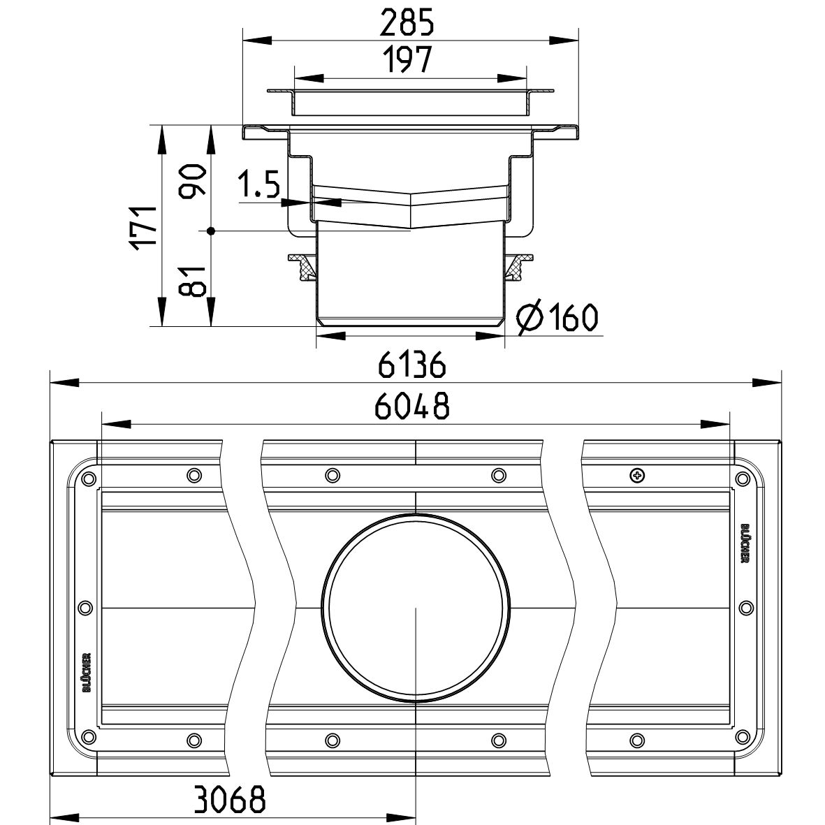 Kanał do winylu 200x6000, z odpływem na środku odpływ DN 160, wymiar zewn. 285 mm x 6136 mm