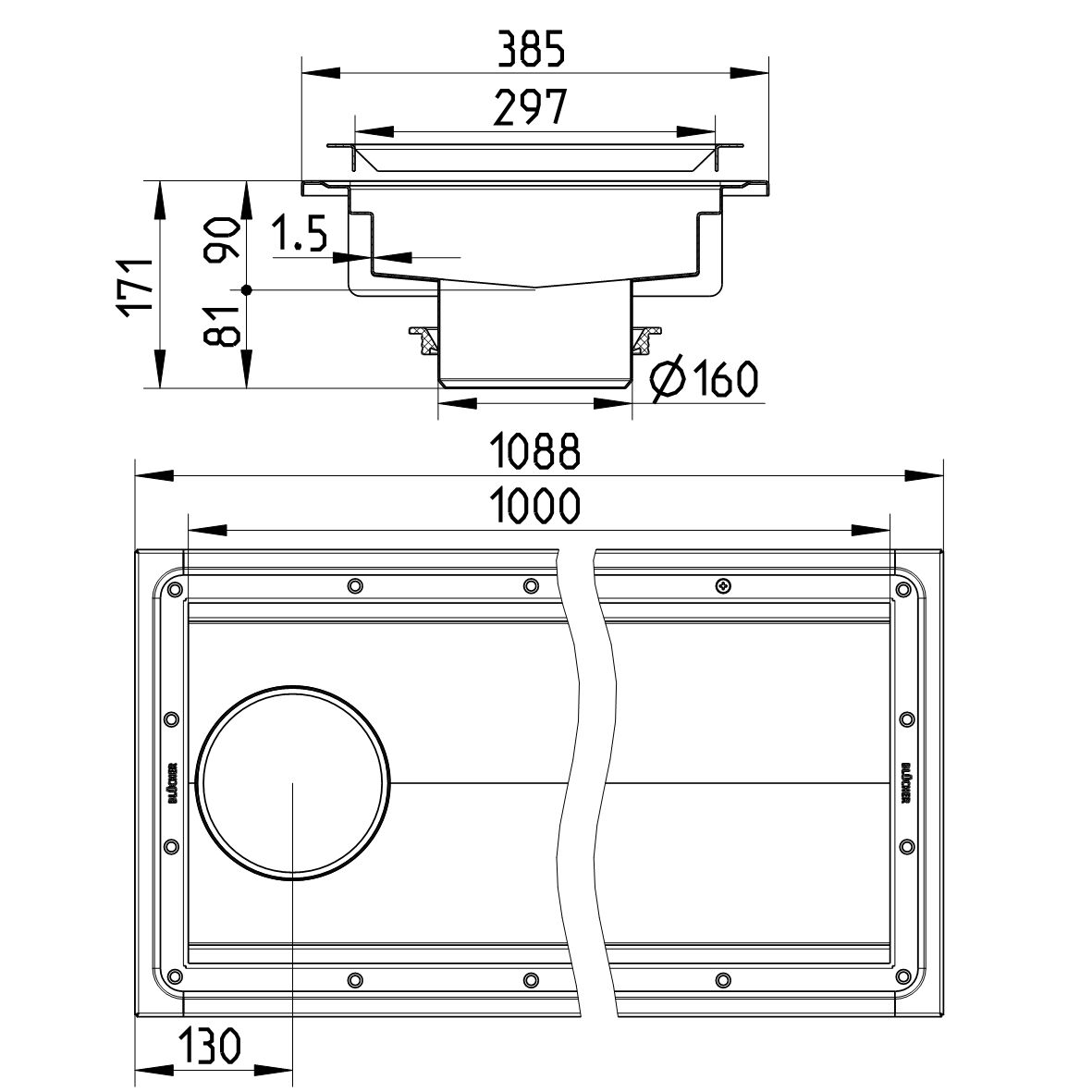 Kanał do winylu 300x1000, z odpływem na końcu odpływ DN 160, wymiar zewn. 385 mm x 1088 mm