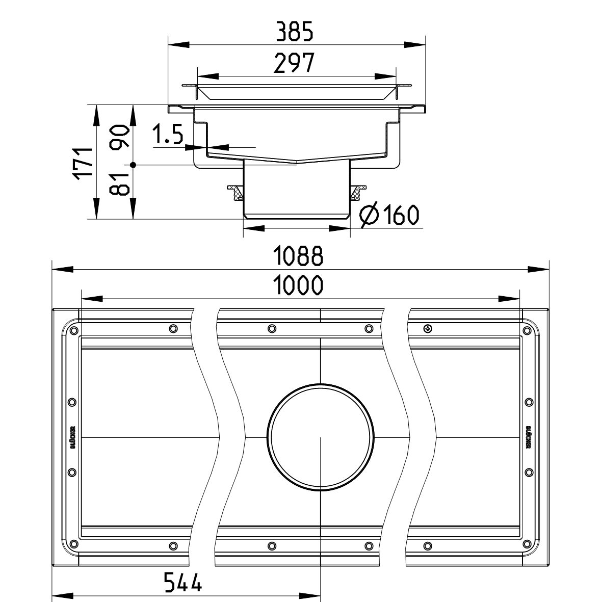 Kanał do winylu 300x1000, z odpływem na środku odpływ DN 160, wymiar zewn. 385 mm x 1088 mm