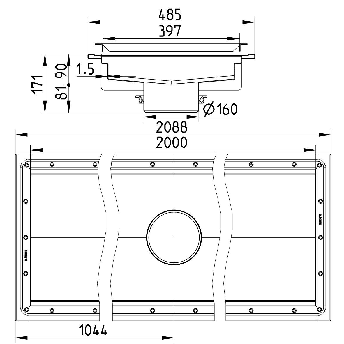 Kanał do winylu 400x2000, z odpływem na środku odpływ DN 160, wymiar zewn. 485 mm x 2088 mm