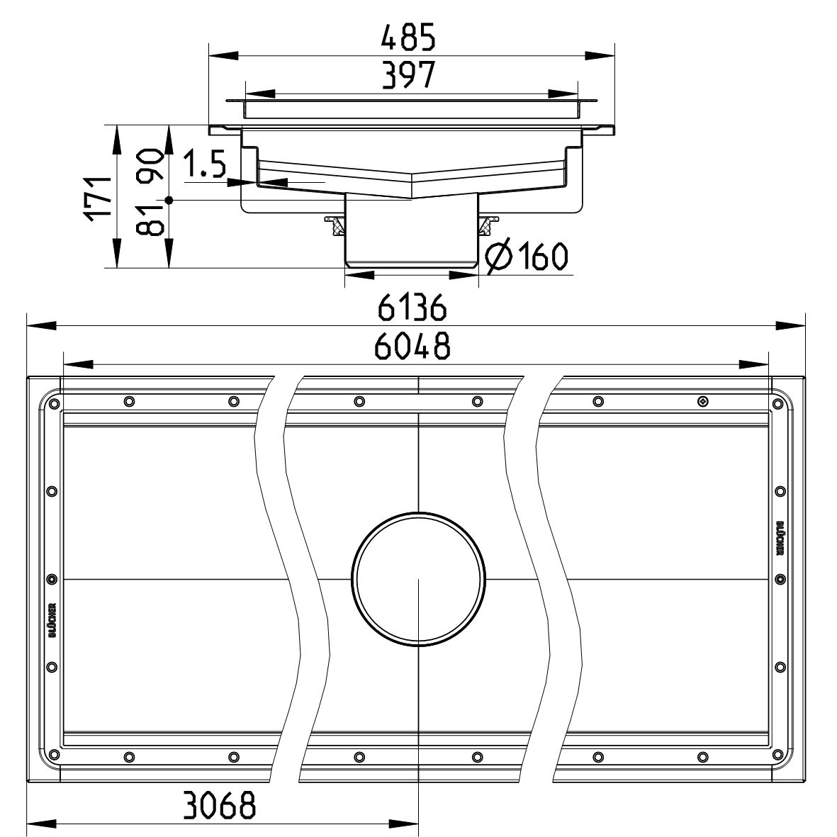 Kanał do winylu 400x6000, z odpływem na środku odpływ DN 160, wymiar zewn. 485 mm x 6136 mm