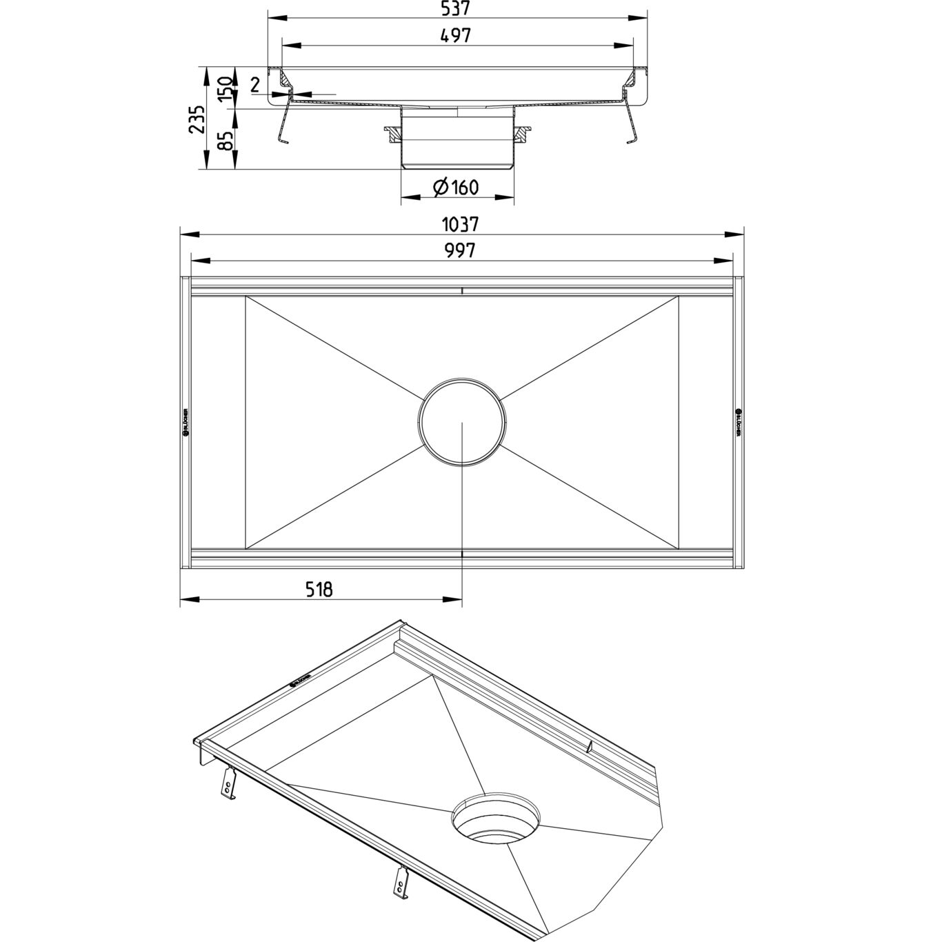 Kanał kuchenny 500x1000 odpływ DN 160, wys. wewn.150 mm