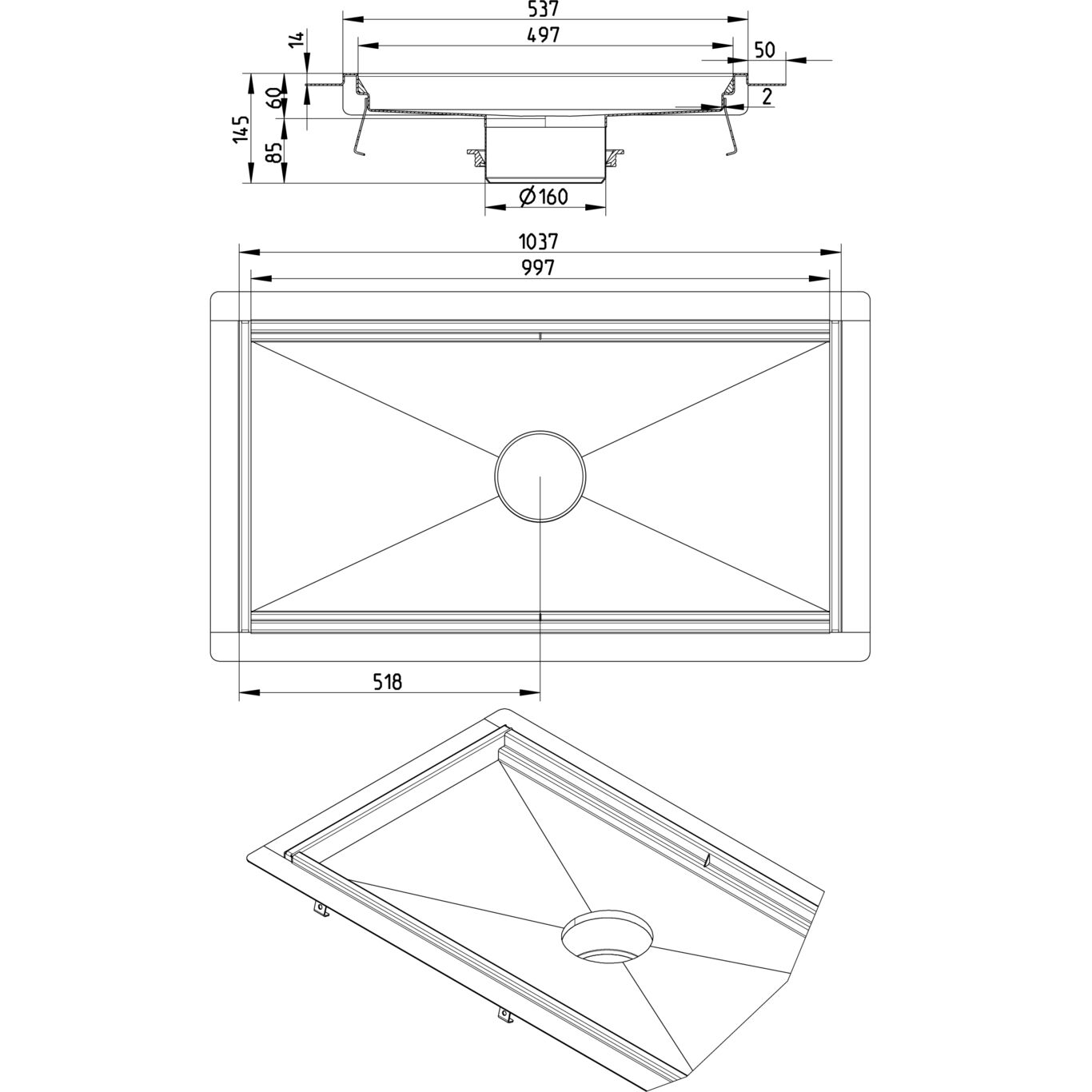 Kanał kuchenny 500x1000 odpływ DN 160, z kołnierzem do podłóg z izolacją wylewaną, wys. wewn. 60 mm