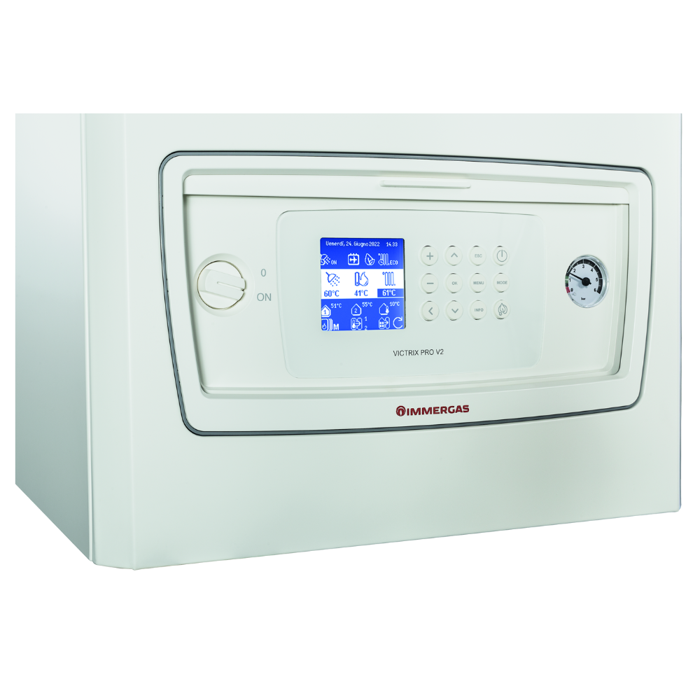 VICTRIX PRO V2 EU to nowa seria wiszących, gazowych kotłów kondensacyjnych, przystosowanych do funkcjonowania indywidualnego bądź w układach kaskadowych. Montaż w kaskadzie to wysoka wydajność przy obniżonych kosztach eksploatacji. Nowy układ spalania podłączony do elektroniki kotła zapewnia szeroki zakres modulacji mocy, od 10% do 100%, gwarantując niskie zapotrzebowanie na gaz, szczególnie w tzw. okresach przejściowych (wiosna/jesień). Nowoczesne palniki gwarantują wyjątkowo niską emisję zanieczyszczeń do atmosfery (kotły należą do najbardziej ekologicznych, klasa 6 przewidziana przez Normy Europejskie). Dodatkowe ograniczenie emisji zanieczyszczeń do atmosfery jest zapewnione dzięki możliwości pracy kotłów VICTRIX PRO V2 EU z 20% domieszką wodoru. Nowe pompy modulacyjne o niskim zużyciu energii płynnie zmieniają prędkość obrotową, kontrolując ΔT pomiędzy zasilaniem i powrotem, a w konsekwencji zmniejszając zużycie energii i gwarantując bezgłośną pracę. W przypadku instalacji jednokotłowej, kocioł VICTRIX PRO V2 EU może współpracować z zewnętrznym zaworem 3-drogowym, służącym do rozdziału c.o./c.w.u. Kotły z serii VICTRIX PRO V2 EU posiadają możliwość pracy w trybie tzw. „prostej kaskady", bez użycia zewnętrznego regulatora. W tym układzie można połączyć maksymalnie 15 urządzeń. Kotły VICTRIX PRO V2 EU mogą być montowane na ścianie lub na specjalnie zaprojektowanej razie nośnej. Immergas Polska oferuje szeroką gamę elementów uzupełniających: zestawy hydrauliki kaskadowej, układy kominowe, stacje uzdatniania wody, neutralizatory kondensatu i inne.