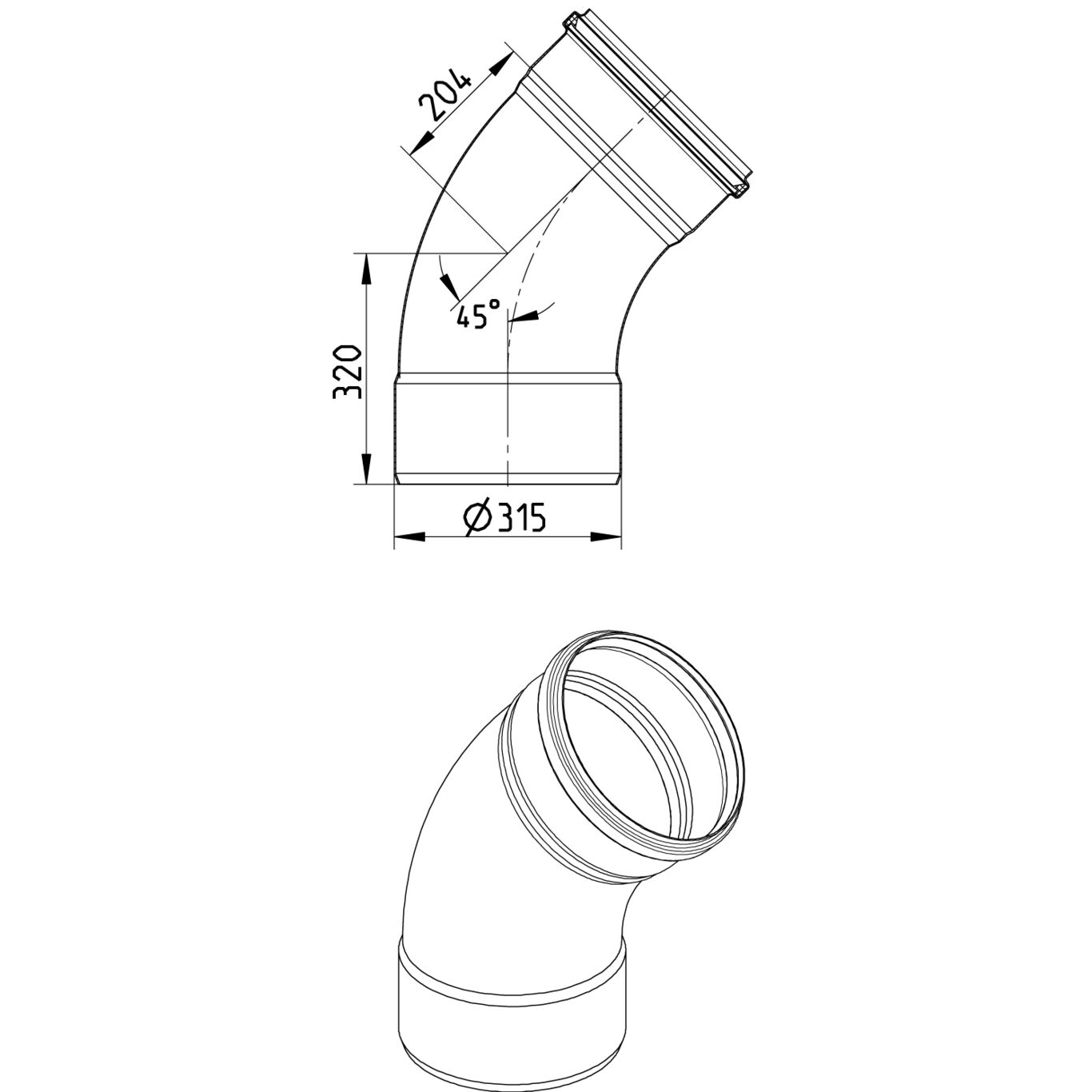 Kolano długi promień 45 st., DN =315mm, stal kwasoodporna