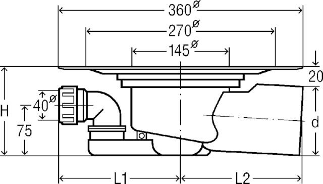 Advantix-korpus odpływu podłogowego, wymiar systemowy 145, nie występuje: nasadka. Wyposażenie: Korek, kołnierz uszczelniający, syfon wyjmowalny, dopływ DN40 obrotowy, wg PN-EN 1253, nr wzoru 4955.15, nr kat. 285 043, DN: 100 d: 110 L1: 180 L2: 185 H: 130 wydajność odpływu przy wysokości spiętrzenia 10 mm: 1.2 l/s, wydajność odpływu przy wysokości spiętrzenia 20 mm: 1.7 l/s, wydajność dopływu: 2.5 l/s, odpływ poziomy,
