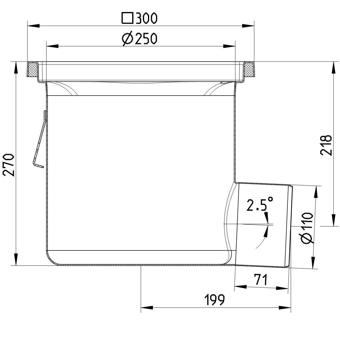 Korpus wpustu przemysłowego, jenoczęściowego, góra kwadrat 300, odpływ poziom DN =110-V, stal kwasoodporna