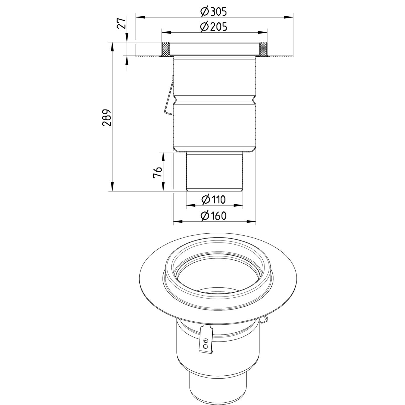 Korpus wpustu przemysłowego, jenoczęściowego, góra okrągła 200, odpływ pion 110, z kołnierzem do izolacji
