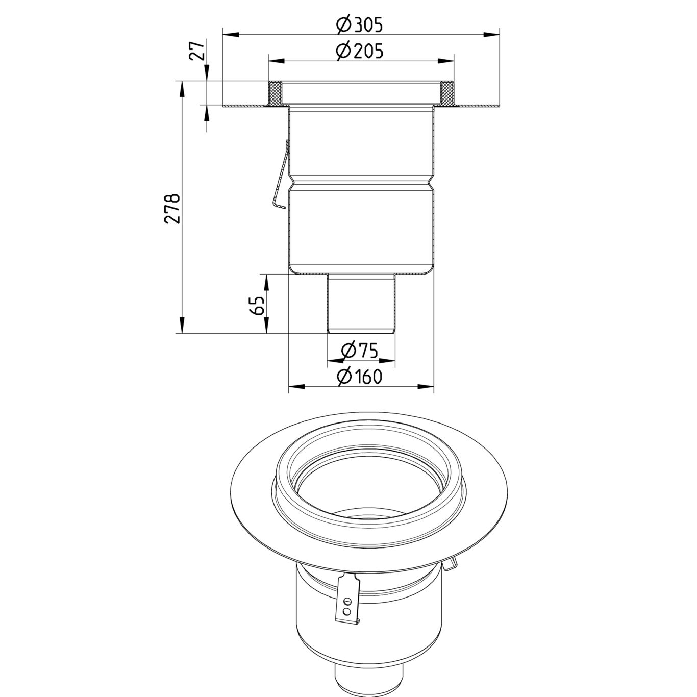 Korpus wpustu przemysłowego, jenoczęściowego, góra okrągła 200, odpływ pion 75, z kołnierzem do izolacji