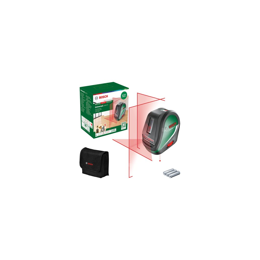 Bez względu na to, czy chodzi o układanie nowych płytek podłogowych czy instalowanie kabiny prysznicowej lub ścian w zabudowie suchej, laser Bosch UniversalLevel 3 ułatwia wykonanie skomplikowanych zadań. Dzięki skrzyżowanym liniom i drugiej pionowej linii laserowej lasera krzyżowego można używać do wyrównywania elementów w poziomie i pionie oraz do wyrównywania elementów pod katem prostym. Druga pionowa linia laserowa jest linią referencyjną 90° dla pierwszej linii, umożliwiając precyzyjne wyrównywanie elementów w dowolnym pomieszczeniu. Używaj funkcji nachylenia do prac poza zakresem automatycznej niwelacji urządzenia, takich jak instalowanie poręczy schodowych. Kąt otwarcia wiązki 120° pozwala wyświetlać dłuższe linie laserowe i zapewnia dokładność nawet przy niewielkiej odległości. Urządzenie posiada także zintegrowany gwint 1/4'' do mocowania na statywie, oferuje dokładność niwelacyjną ±0,5 mm/m i zasięg maksymalny 10 m.