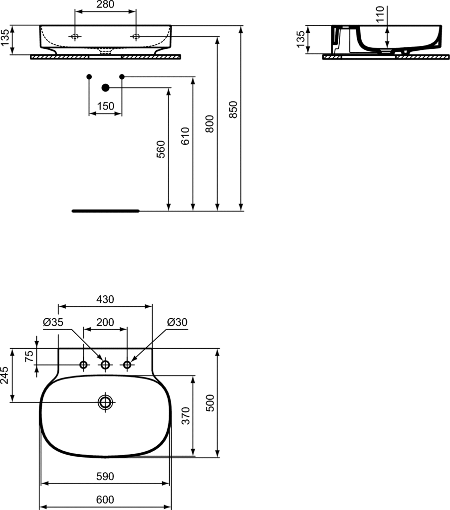 Umywalka Linda-X wisząca, nieszlifowana od spodu, do samodzielnego montażu. Z 3 wybitymi otworami na baterię, bez przelewu. Niezbędny montaż z ukryty system przelewowy IdealFlow N8326AA lub syfon typu free flow E2114xx - w osobnym zamówieniu.