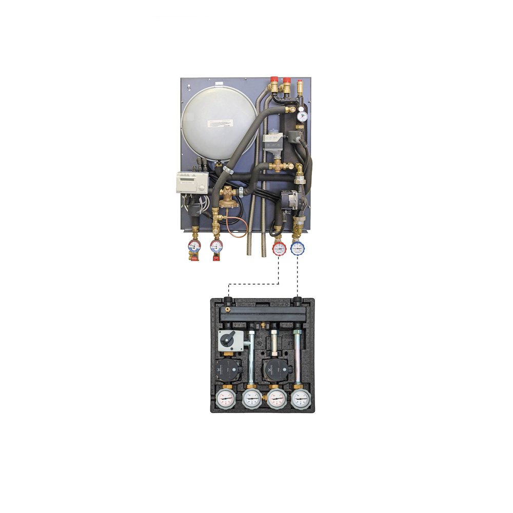 naczynia przeponowego 12 I, manometrów, termometrów, rozdzielacza, obiegu grzewczego bez mieszacza z pompą UPM3 AUTO 15-70, obiegu grzewczego z mieszaczem i pompą UPM3 AUTO 15-70, obudowy, sterownika pogodowego, izolacji. Max. moc dla c.o. 26 kW.