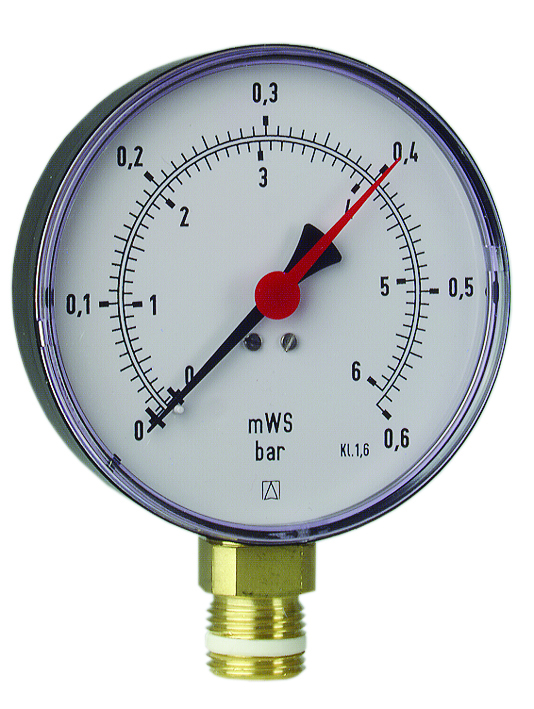 Przyrząd do otwartych instalacji grzewczych. Wyposażony w podwójną skalę (bar i mH2O) i czerwoną przestawną wskazówkę.