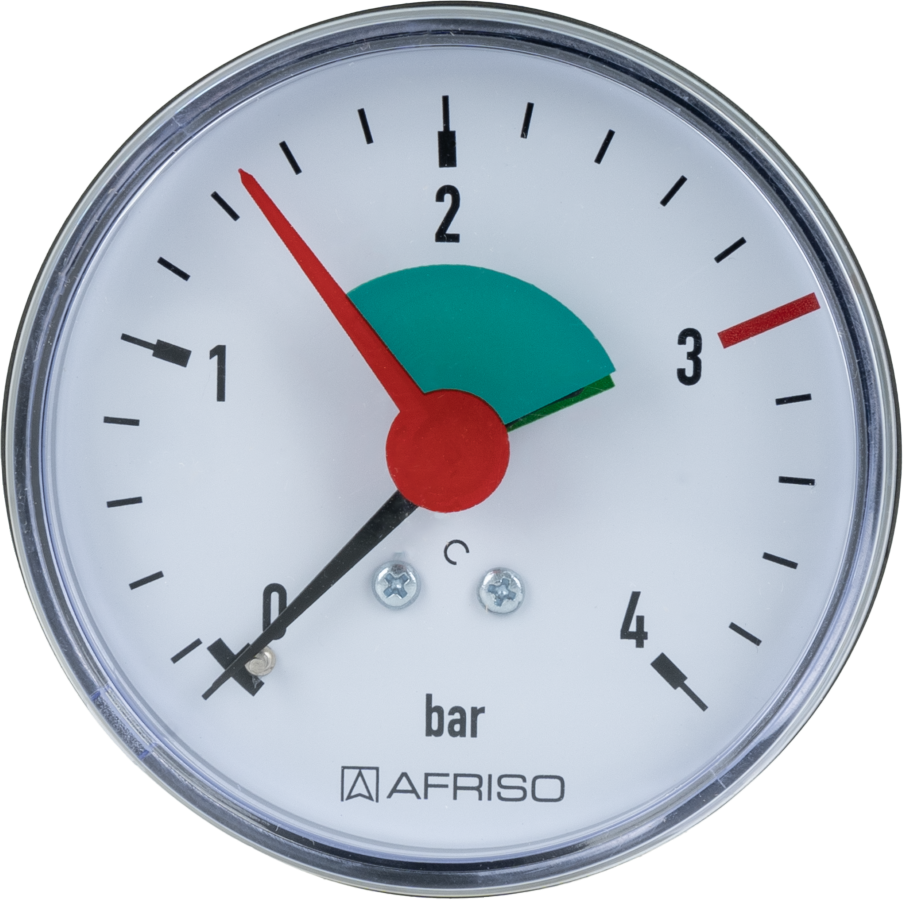 Przyrząd do zamkniętych instalacji grzewczych o Pmax 3 bar. Zielony obszar na tarczy wskazuje optymalny zakres ciśnienia.
