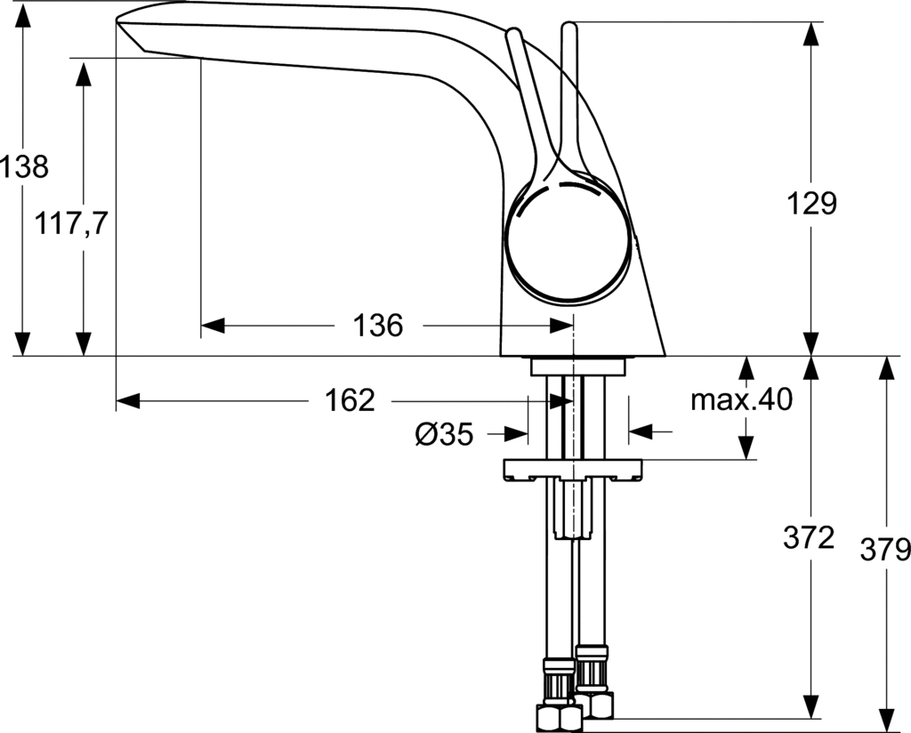 Bateria umywalkowa jednootworowa Melange. Głowica 35 mm z ogranicznikiem przepływu gorącej wody. Odlewany korpus bez otworu na pręt wysuwany. Czerwone i niebieskie oznaczenie na uchwycie. Metalowy automatyczny korek. Ukryty perlator typu Cache M21,5x1. Elastyczne węże G3/8”.