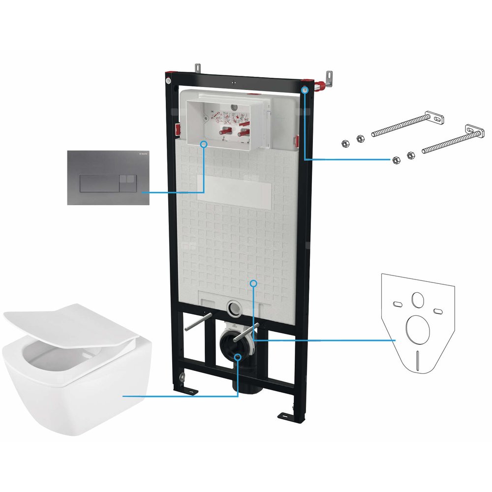 Zestaw WC z wiszącą miską pomyślany został z myślą o wysokiej estetyce pomieszczenia oraz łatwości sprzątania. Trwała ceramika wysokiej jakości nie pęka i nie zmienia koloru nawet po długim czasie użytkowania, co zostało potwierdzone badaniami Deante. Uniwersalny, klasyczny, biały kolor zestawu WC nadaje pomieszczeniu elegancji. Przystosowany do instalacji podtynkowych. Elegancko wykończony, ozdobi każdą łazienkę. Jest to kompletny zestaw 6 w 1, w skład którego wchodzi: stelaż podtynkowy, miska bezkołnierzowa WC, cicho opadająca deska, elegancki przycisk spłukujący, mata amortyzująca i śruby montażowe.