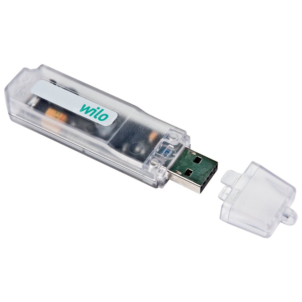 Pamięć USB do bezprzewodowej wymiany danych dla wszystkich pomp Wilo sterowanych elektronicznie z interfejsem podczerwieni; można ją dostosować do wszystkich dostępnych w handlu komputerów stacjonarnych/laptopów z systemem Windows wyposażonych w interfejs USB.