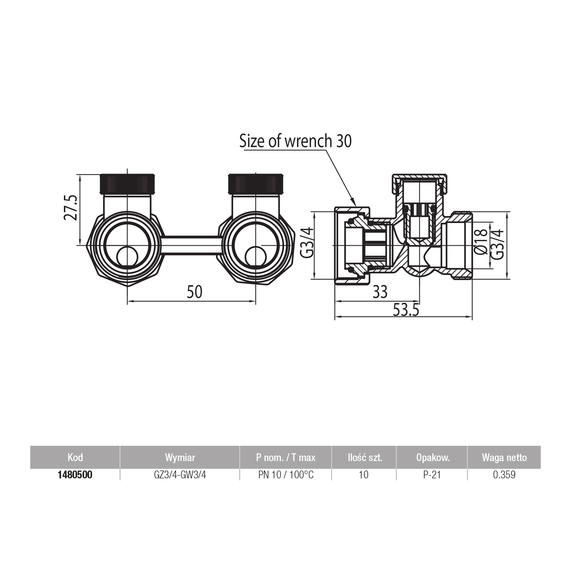 Moduł przyłączeniowy prosty VALVEX FUSION 3 mosiądz (niklowany) 3/4'' x 3/4'', rozstaw 50 mm do grzejników