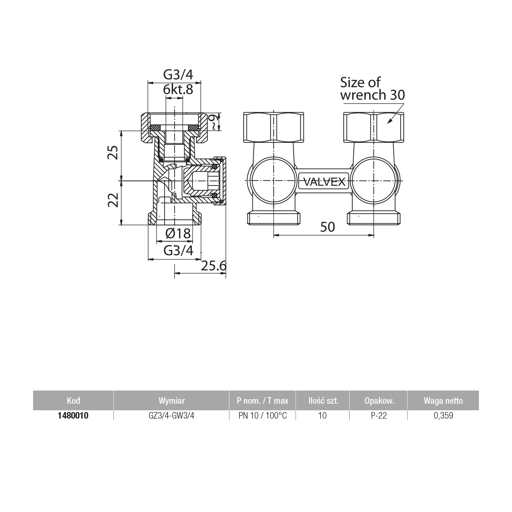 Moduł przyłączeniowy prosty VALVEX FUSION tulejki mosiądz (niklowany) 3/4'' x 3/4'', rozstaw 50 mm do grzejników