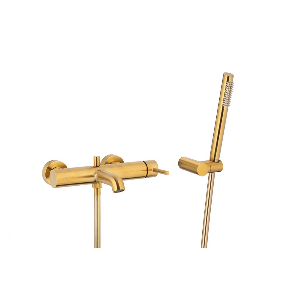 Bateria moza wannowa ścienna, pozioma, brushed gold z kompletem natryskowym punktowym premium