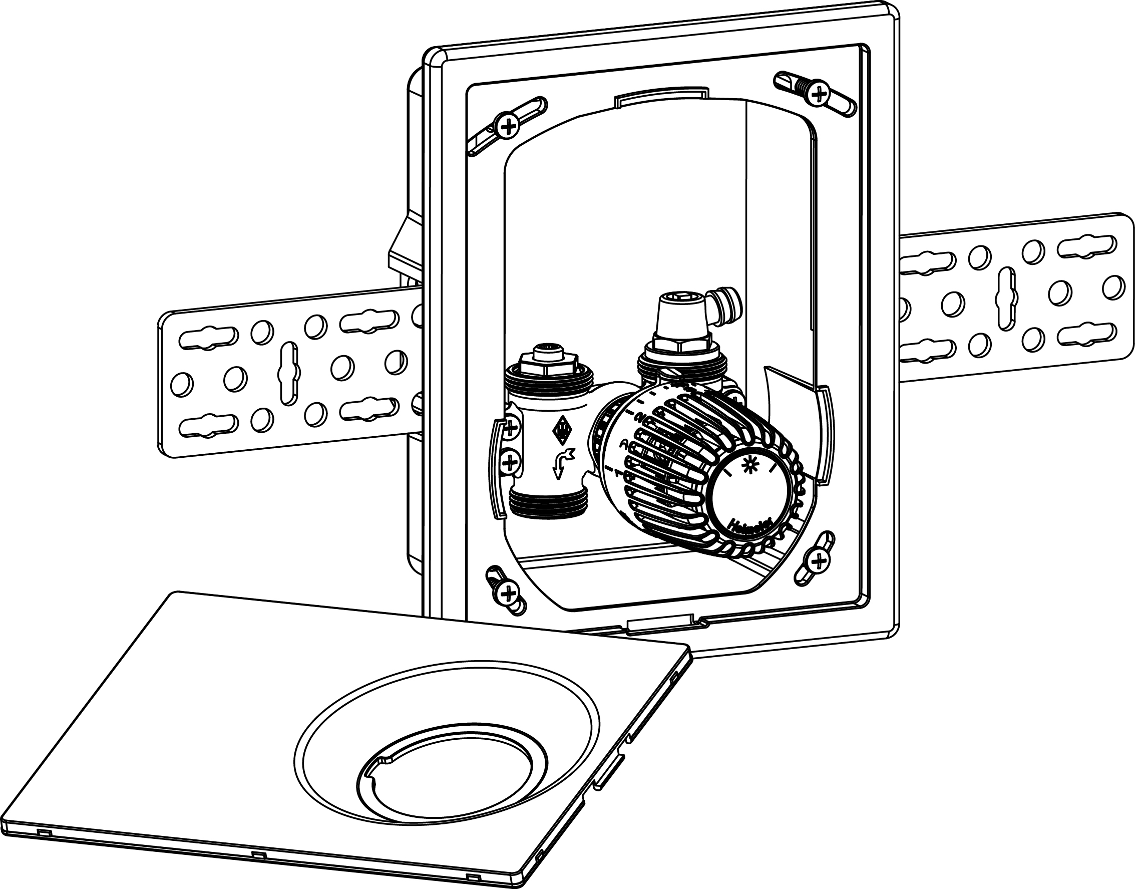 Gwarantuje, że wymagany przepływ nie zostanie przekroczony. Możliwość wyrównania w razie zabudowy odchylonej od pionu do 6˚ dla każdej ze stron. Pokrywa maskująca śruby mocujące. Elastyczne dopasowanie do wszystkich konstrukcji ścian, głębokość kompensacji 30 mm.