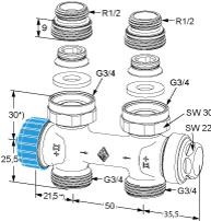 Termostatyczny zawór Multilux stosowany jest do podłączenia grzejników dolnozasilanych z przyłączem dwupunktowym, np. grzejników łazienkowych, grzejników uniwersalnych, itp. Rozstaw osi przyłączy 50 mm.