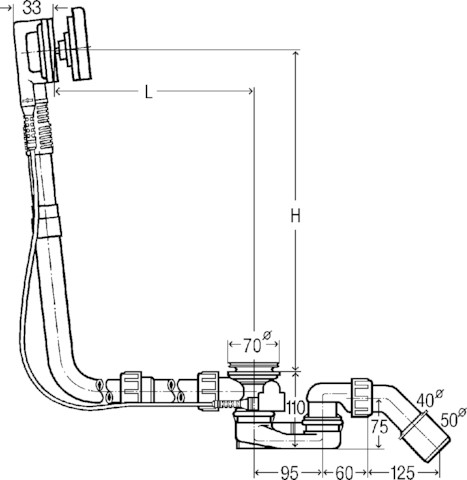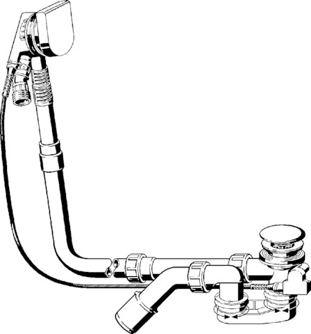 Multiplex Trio-komplet odpływowo-przelewowy, Visign MT9, podwyższenie poziomu wody plus 5 cm. Przeznaczenie: dopływ wody przez korpus armatury przelewowej, płaskie wykonanie: tylko 33 mm wymaganego miejsca z tyłu wanny, do wyboru możliwość podwyższenia poziomu wody. Wyposażenie: Rozeta przelewowa, pokrętło chromowane, korek do zaworu chromowany, syfon, łuk odpływowy 45°, zawór chromowany. Dane techniczne: wysokość zamknięcia wodnego 50 mm, wydajność odpływu przy wysokości spiętrzenia 300 mm 0,92 l/s, wydajność przelewu wysokość spiętrzenia 60 mm nad środkiem otworu przelewowego 0,63 l/s. Wskazówka: Patrz aktualny przegląd wskazówek dotyczących zastosowania!, nr wzoru 6170.12, nr kat. 733 612, DN: 40/50 długość cięgna Bowdena: 1070 L: 100-680 H: 180-480 wanna o długości niestandardowej, do wanien z otworem odpływowym Ø 52, wykonanie: chromowane