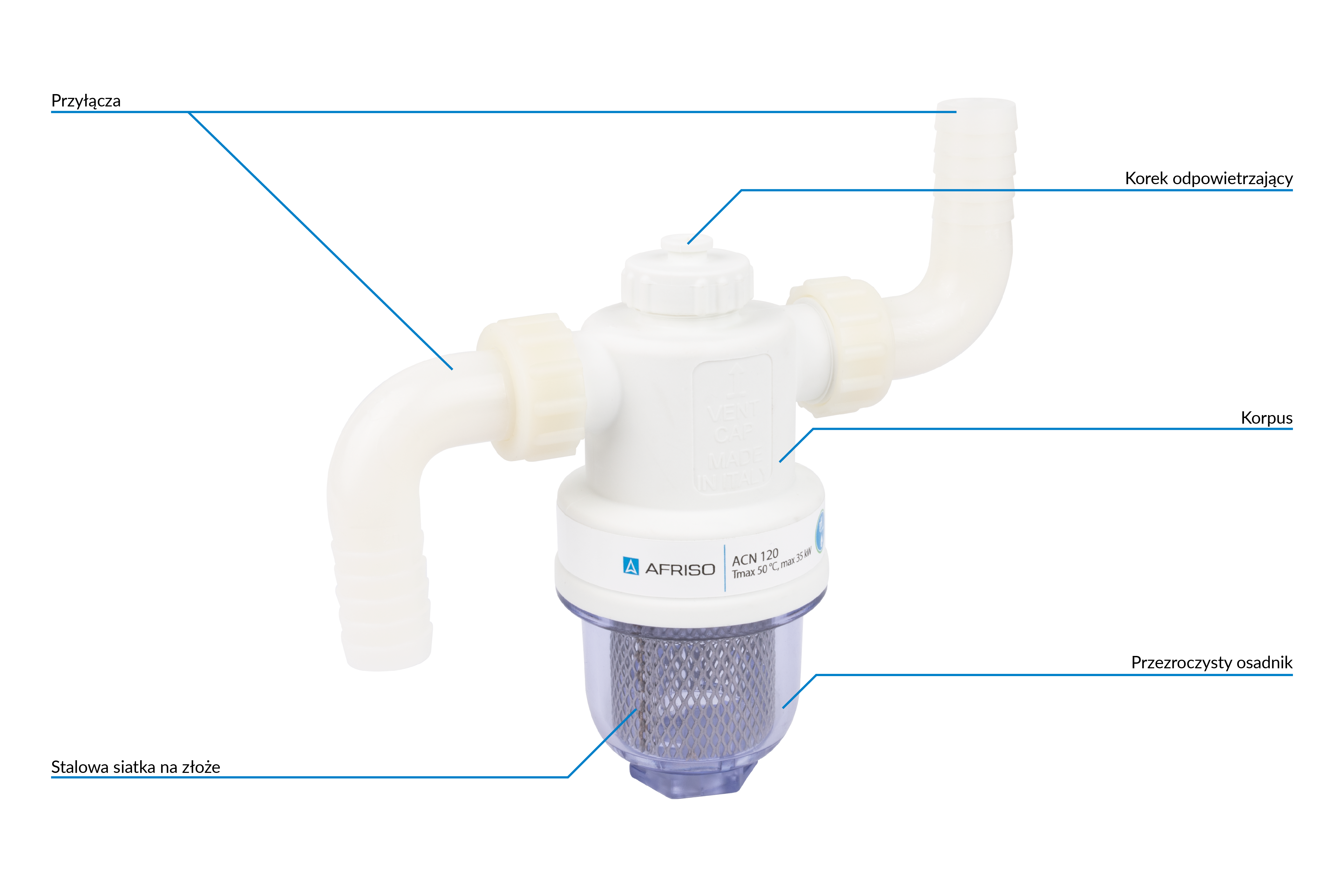 Przeźroczysty osadnik pozwala łatwo kontrolować ilość złoża wewnątrz neutralizatora.