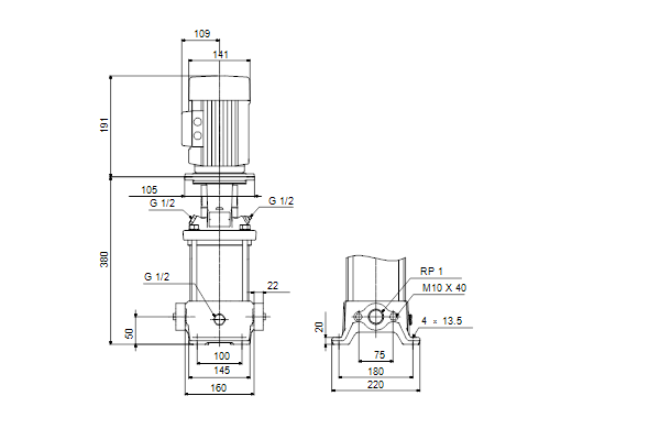 Pionowa, wielostopniowa pompa odśrodkowa z króćcami ssawnym i tłocznym na tym samym poziomie (linii). Głowica pompy i podstawa wykonane są z żeliwa - wszystkie inne części zwilżane wykonane są ze stali nierdzewnej. Przeniesienie mocy odbywa się poprzez sprzęgło dzielone. Pompa jest wyposażona w 3-fazowy asynchroniczny silnik elektryczny, chłodzony wentylatorem, montowany na stopach.