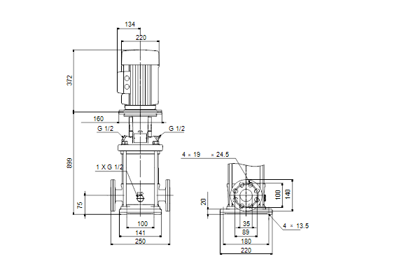Pionowa, wielostopniowa pompa odśrodkowa z króćcami wlotowymi i wylotowymi na tym samym poziomie (inline). Głowica i podstawa pompy są wykonane z żeliwa, a wszystkie inne części zwilżane ze stali nierdzewnej. Specjalna konstrukcja pierwszego stopnia „Low NPSH” zmniejsza wartość NPSHr pompy. Kastowe uszczelnienie wału zapewnia wysoką niezawodność, bezpieczną obsługę oraz łatwy dostęp i serwis. Przenoszenie mocy odbywa się za pomocą sztywnego sprzęgła dzielonego. Połączenie rurowe odbywa się za pomocą połączonych kołnierzy DIN-ANSI-JIS. Pompa jest wyposażona w 3-fazowy, chłodzony wentylatorem silnik asynchroniczny.